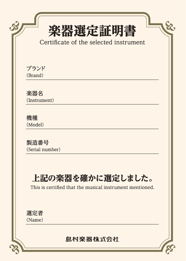 メーカーによってデザインや書式は異なりますが、一流アーティストによる選定品は、上記のような選定証明書(選定書)が付けられており、楽器と一緒に陳列されている事が多いので、気になる方は探してみてください。
