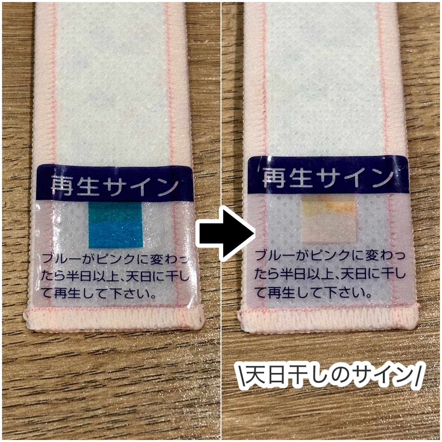 湿気を吸収、または水分を放出し、ケース内の湿度を「適度な範囲に近づける」ことをサポートするシートです。消臭・防カビ効果もあるので、湿度調整とあわせて入れておくだけで一石二鳥。色の変化で使用状況が分かるように、「再生サイン」が付いていますが、どっちがどっち⁉となる方もいらっしゃるのではないでしょうか。ブルーとピンクの2色でお知らせしてくれます↓