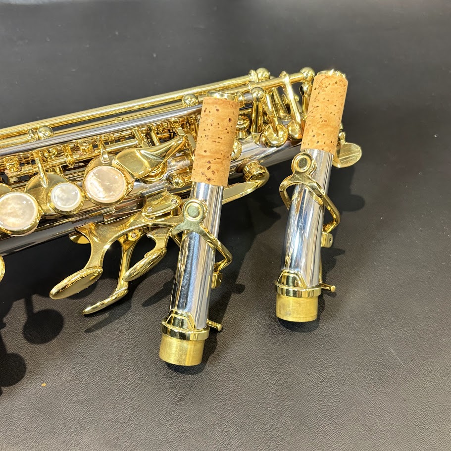 ソプラノには、ネックが2本(ストレート/カーブド)付属しているモデルや、管体と一体化したストレート(ワンピース)タイプなど、いくつか種類があります。構えたときにマウスピースをくわえる角度が微妙に異なるため、吹きやすさや音色にも違いが出てきます。